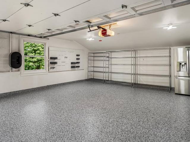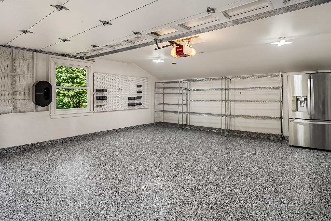 A new paver driveway leads to a freshly painted garage with epoxy floors, custom storage, and a smart opener.