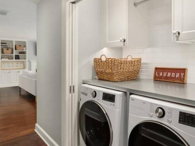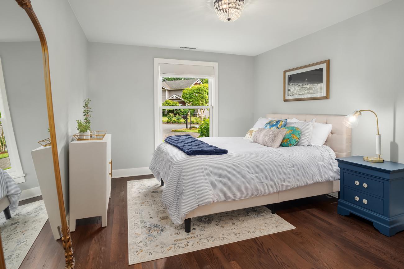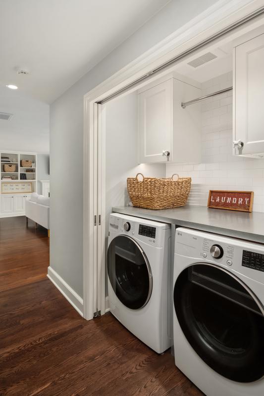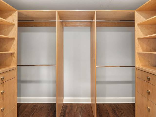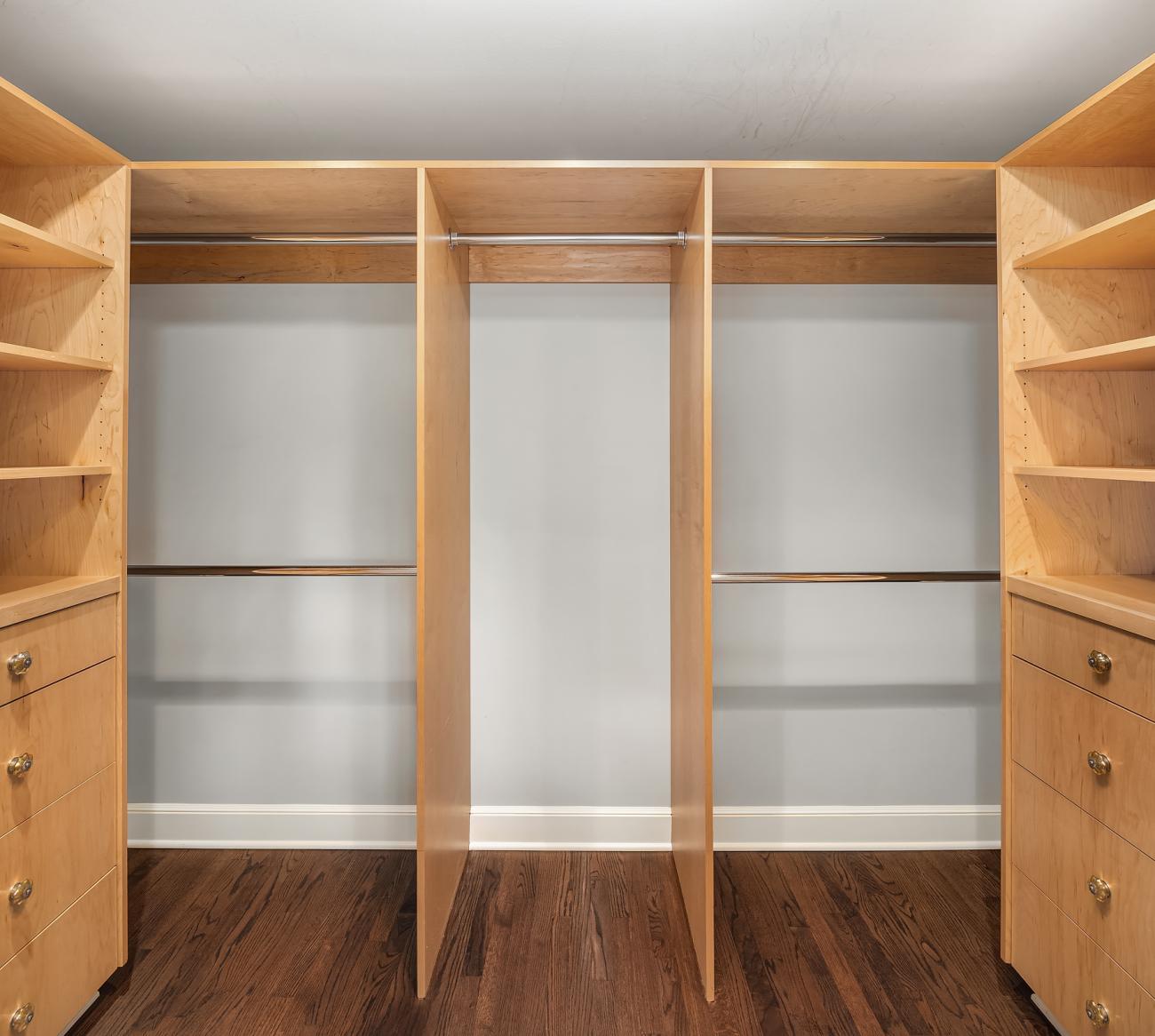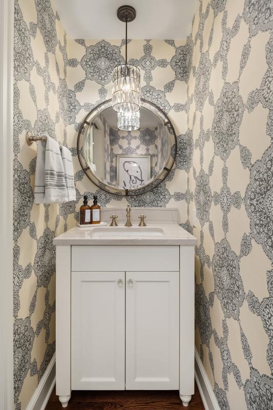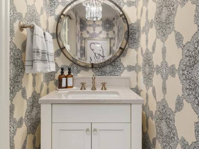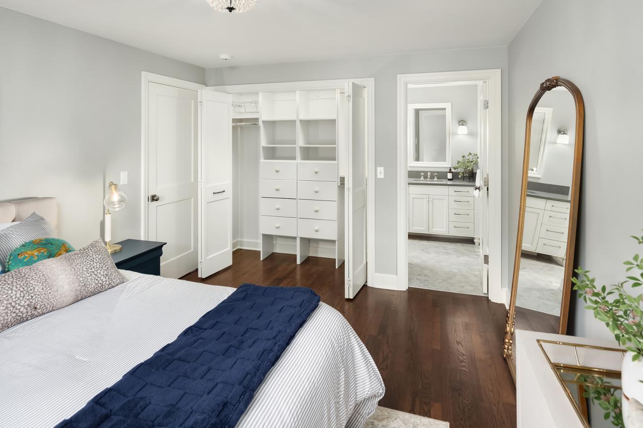The chef’s kitchen features a natural quartzite island, quartz counters, and custom maple cabinetry painted and heat-cured off-site for enhanced durability, complemented by premium Sub-Zero and Thermador appliances. Just off the kitchen, an oversized walk-in pantry offers custom builder-installed maple shelving - combining form and function. Bathrooms showcase Rohl fixtures and bespoke wallpaper, while a secondary bedroom boasts a custom-fit world map mural. Window treatments include custom blackout Roman shades in all bedrooms. All closets are built-in, with aftermarket organizers in secondary bedrooms.
