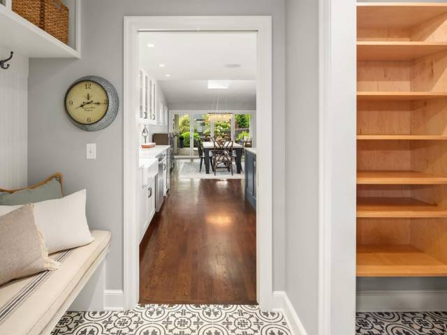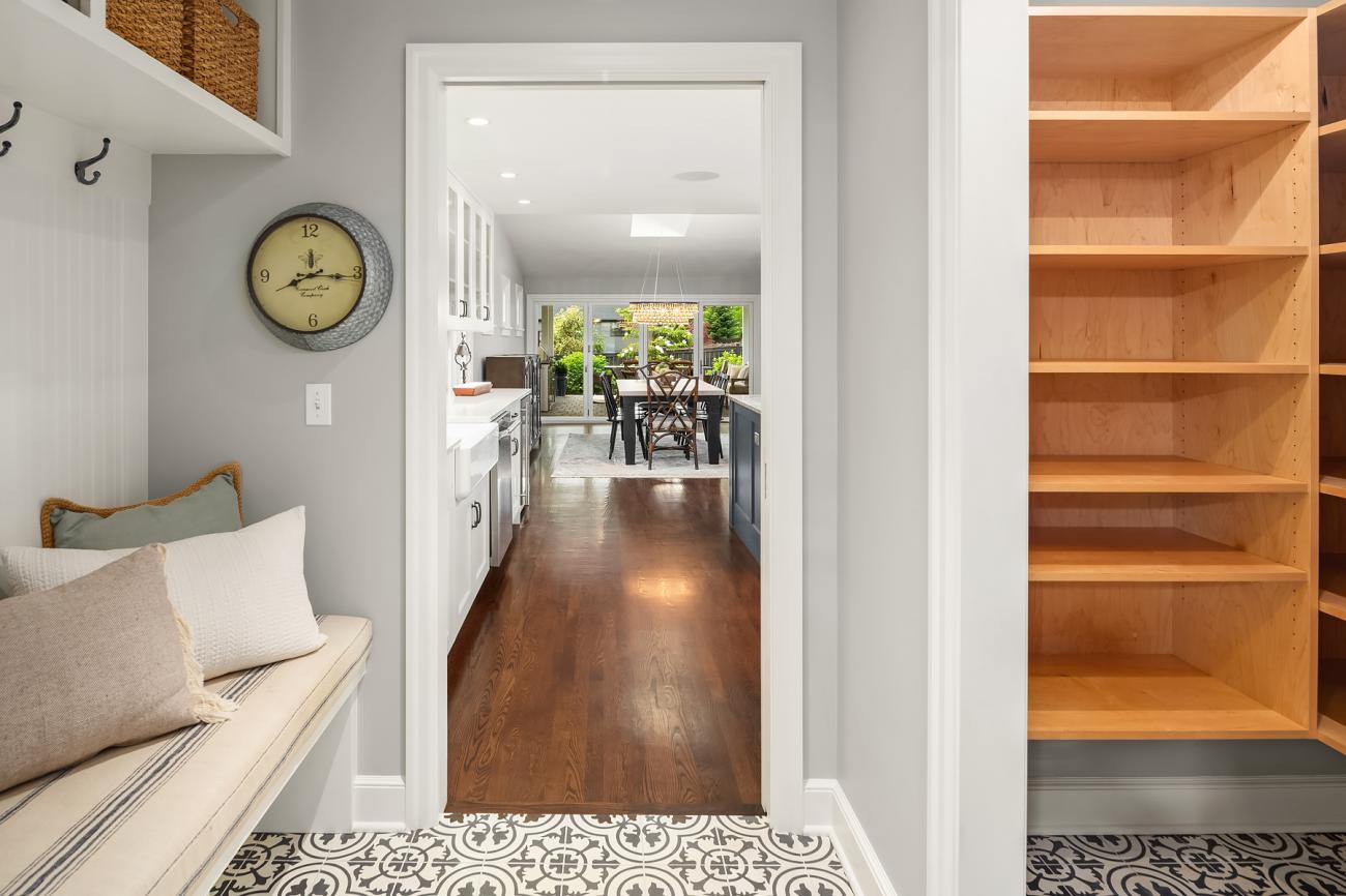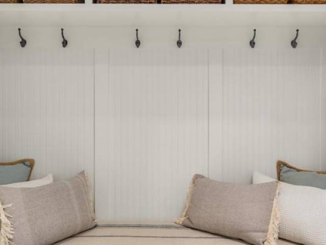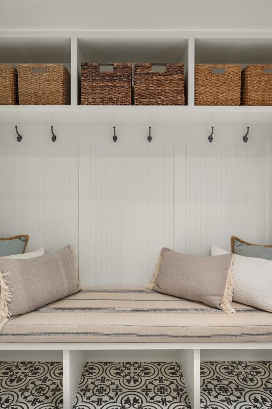 A stylish mudroom adds practicality with durable concrete tile, a custom built-in bench with storage, and a tailored cushion, perfect for everyday entryway organization.
