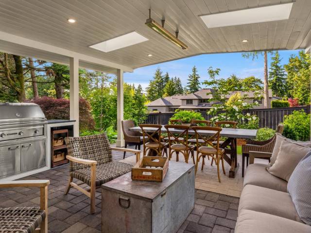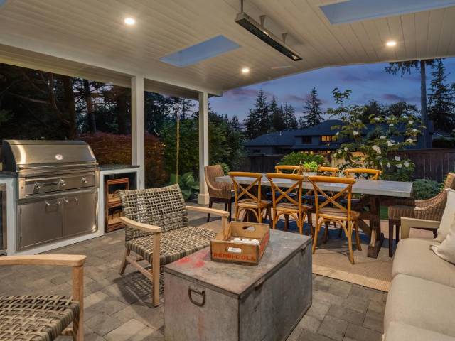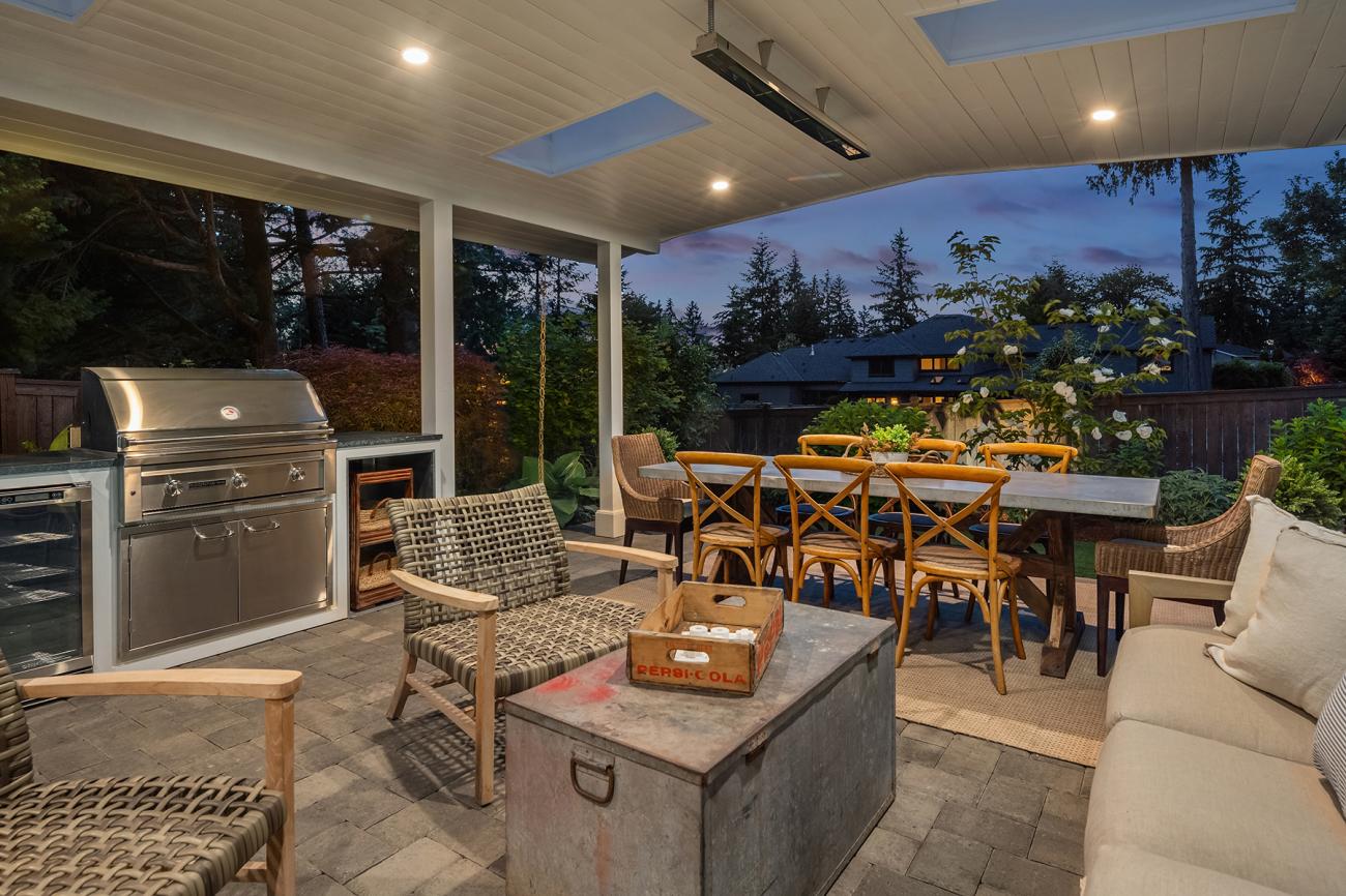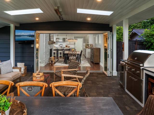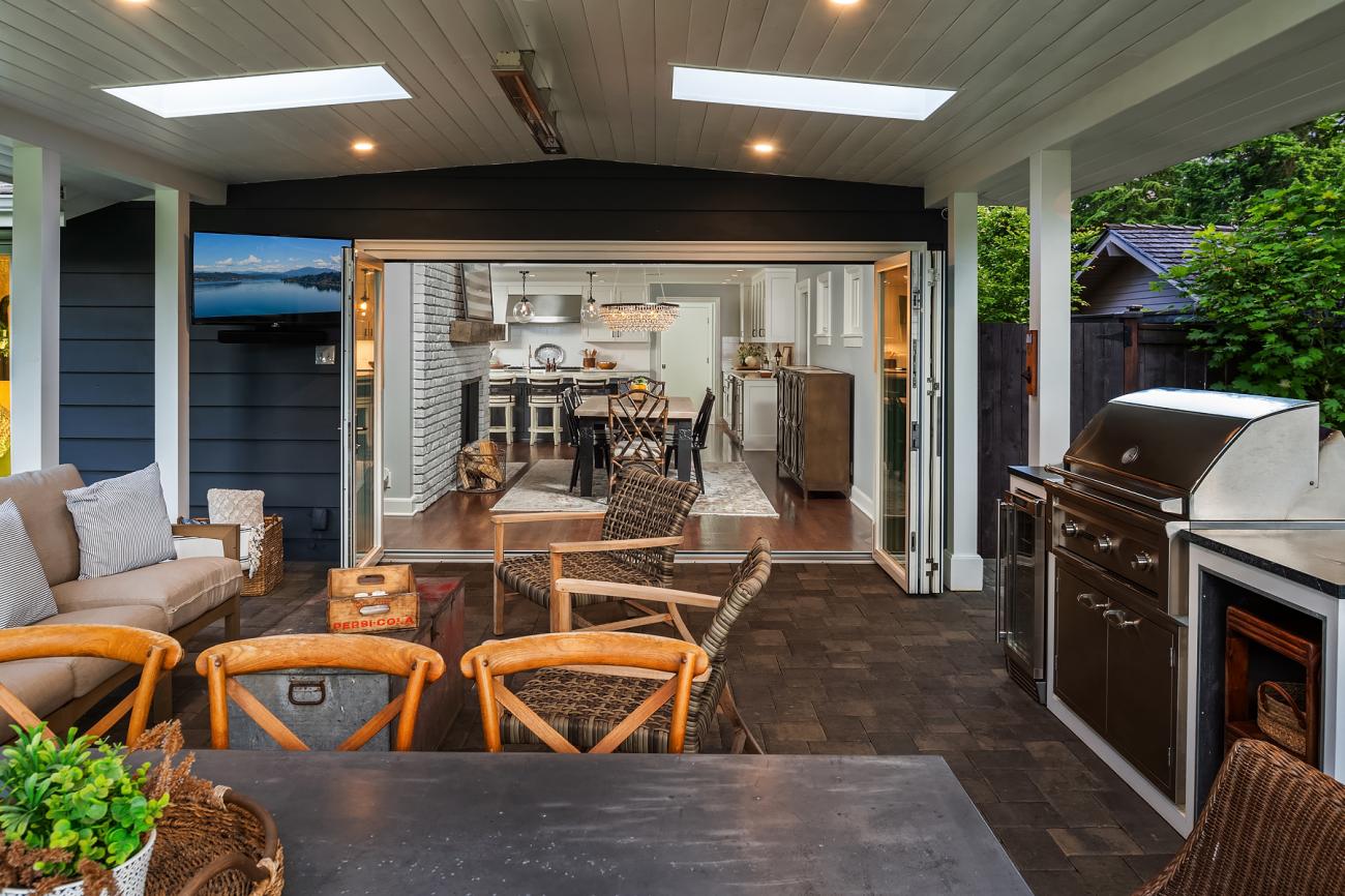 Retractable Nano glass doors open to a covered patio with infrared heaters, a built-in Lynx gas BBQ, outdoor fridge, and landscaping designed by a landscape architect with artificial turf, smart lighting, and automated irrigation.